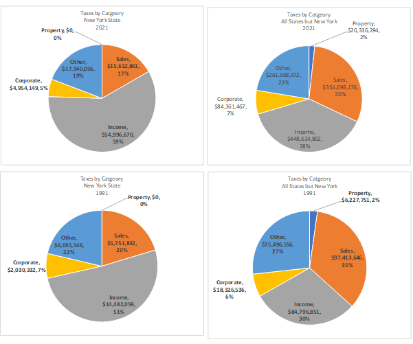 Figure 3 shows New York relying more on PITs as a percentage of revenue than other states and less on other taxes, particularly sales and property tax.[1] The pie charts also show that over time, all states (including NYS), are relying more on income taxes and less on sales tax. Corporate taxes became a smaller percentage in New York, while they increased in other states. As the rest of the country’s economies increasingly rely on corporate income, their tax rates have increased.