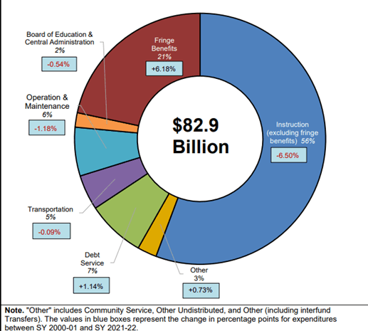 Figure 1 shows the change in the percentages spent in NYS’s major public school districts between the School Years 2000/2001 and 2021/2022. While instruction comprises nearly 60 percent of a district’s costs, this category has experienced a decrease of 6.5 percent of total costs in this period.[4]
